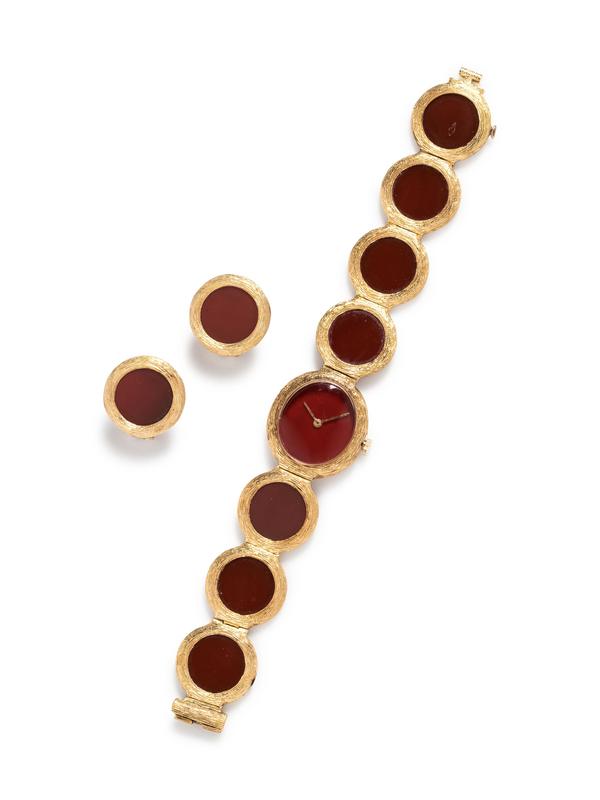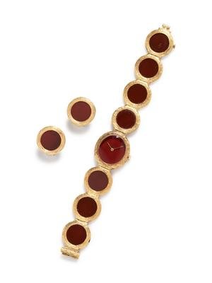 consisting of a watch, 22.00 x 22.00 mm case dimensions, carnelian dial, gold pencil hands, snap on case back, Cal. BM775 17 jewel manual wind movement signed BAUME & MERCIER, integrated bracelet containing seven carnelian plaques, fold over clasp, together with a pair of earclips containing two round carnelian plaques, posts with clip backs.