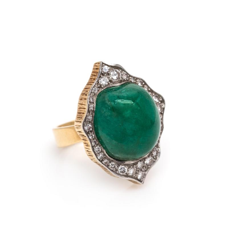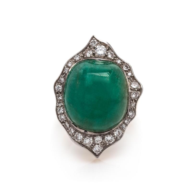 containing one oval freeform cabochon cut emerald measuring approximately 15.50 x 14.22 mm and 31 round brilliant cut diamonds.