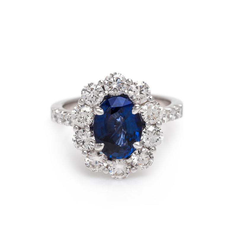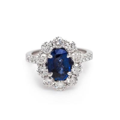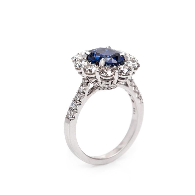 containing an oval cut sapphire measuring approximately 9.97 x 7.50 x 4.88 mm and 20 round brilliant cut diamonds weighing approximately 1.75 carats total, mounted in white gold.