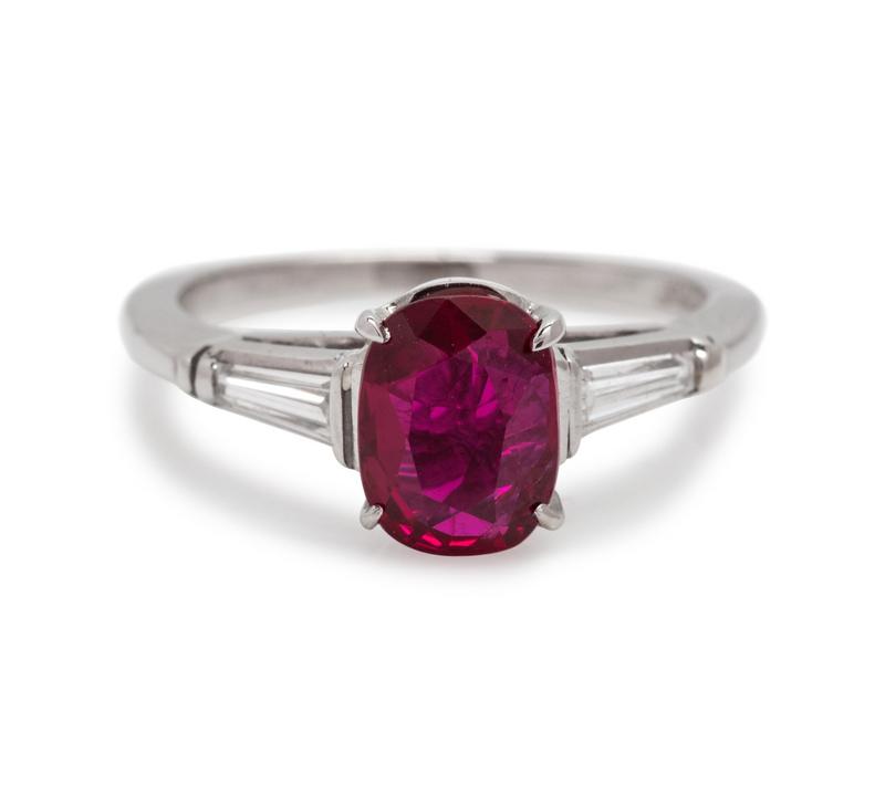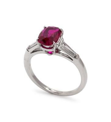containing one oval cushion shape mixed cut ruby measuring approximately 7.56 x 5.75 x 2.97 mm and weighing 1.36 carats and two tapered baguette cut diamonds weighing approximately 0.20 carat total.