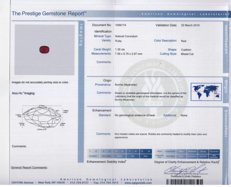 AGL, 2019, Report number 1099174, Natural corundum, Ruby, 1.36 carats, Burma (Myanmar), Unheated