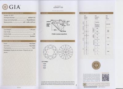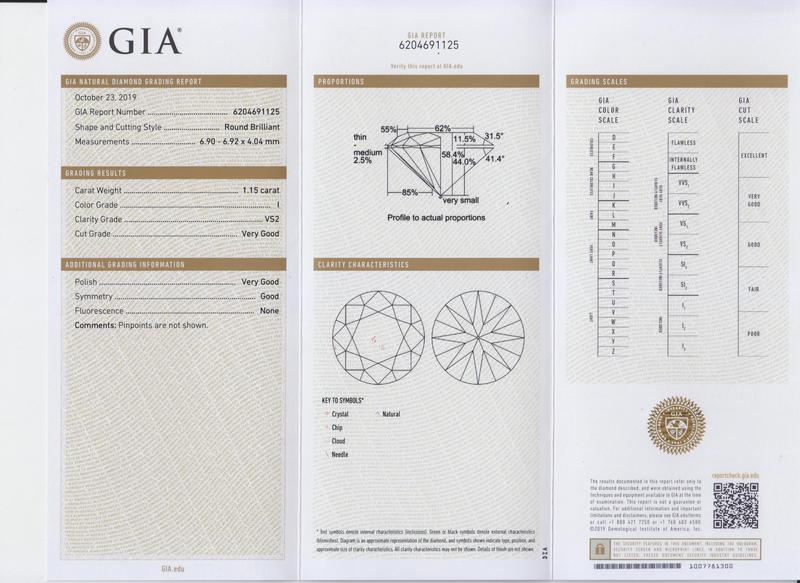 GIA, 2019, Report number 6204691125, 1.15 carats, I color, VS2 clarity, No fluorescence
