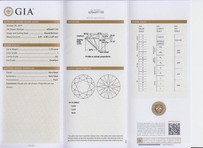 GIA, 2019, Report number 6204691150, 1.15 carats, I color, SI2 clarity, Faint fluorescence