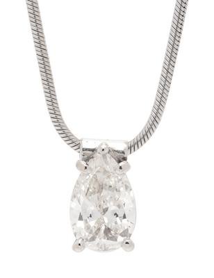 containing one pear shape brilliant cut diamond weighing approximately 1.15 carats, suspended from a snake chain necklace.