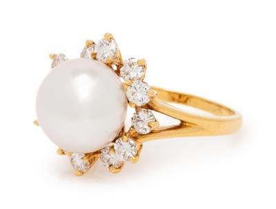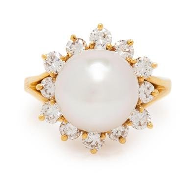 containing one 11.09 mm pearl and 12 round brilliant cut diamonds approximately 1.08 carats total, mounted in yellow gold.