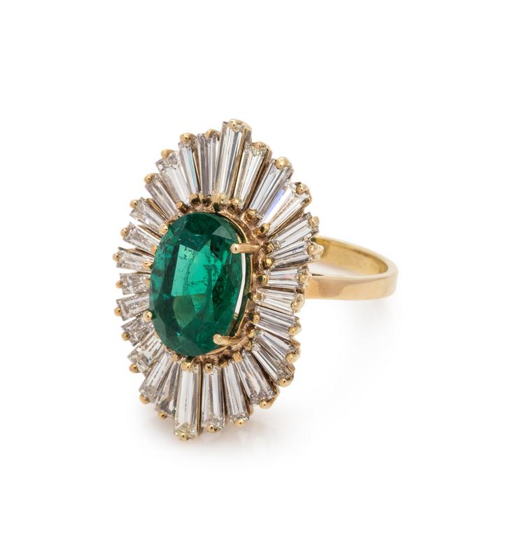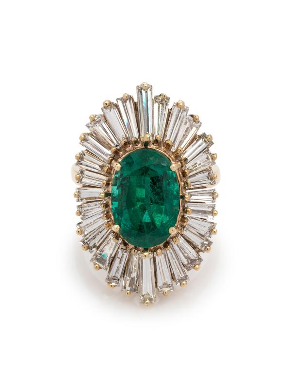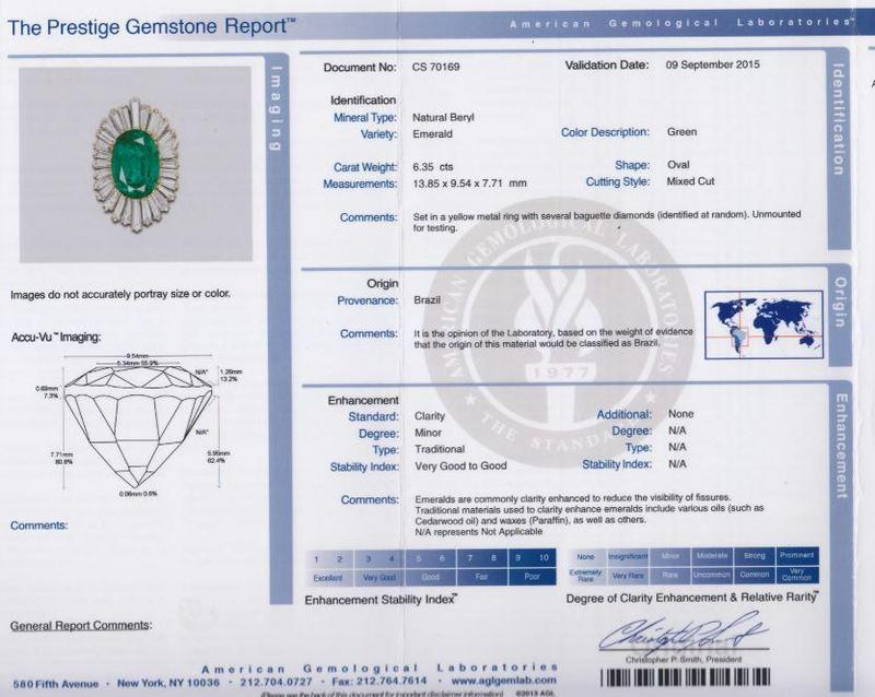 containing one oval mixed cut emerald weighing 6.35 carats and 28 tapered baguette cut diamonds weighing approximately 3.35 carats total.