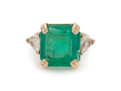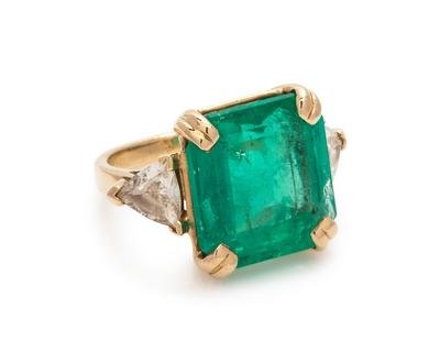 containing one emerald cut emerald weighing approximately 9.60 carats and two triangular brilliant cut diamonds weighing approximately 1.30 carats total.