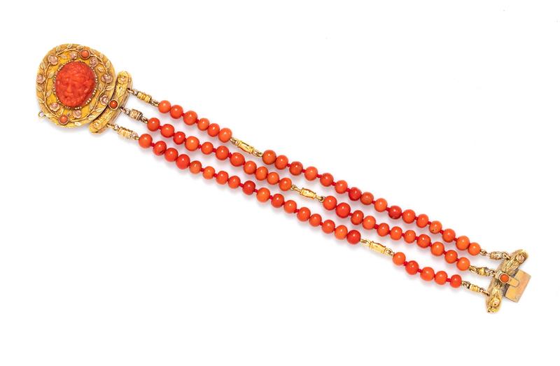 consisting of a three strands containing numerous round coral beads and three gold spacer beads strung knotted with a tricolor gold clasp containing a carved coral cameo of a male profile and four round cabochon cut coral.