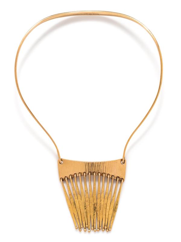 consisting of a sculpted neck collar joined at the front with a fringe pendant.