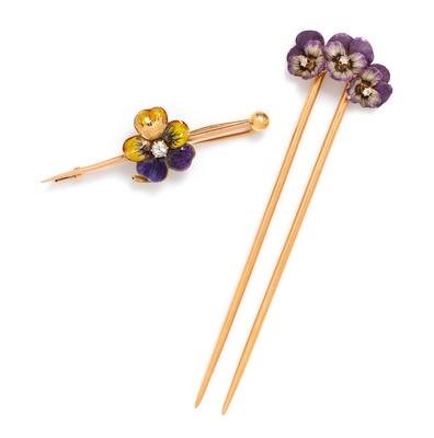 consisting of a hinged hair pin topped with three pansies with polychrome enamel accents and three old European cut diamonds, together with a bar brooch centered with a pansy with polychrome enamel accent and one old European cut diamond.