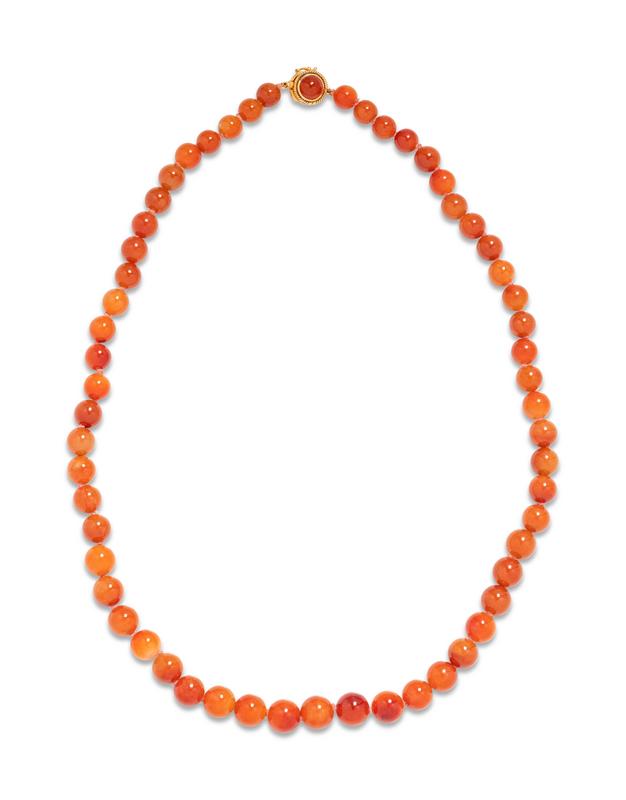attributed to David Lin, containing 57 russet jade beads measuring approximately 7.26-9.45 mm strung knotted with a yellow gold clasp containing one round cabochon cut russet jade measuring approximately 6.90 mm in diameter.