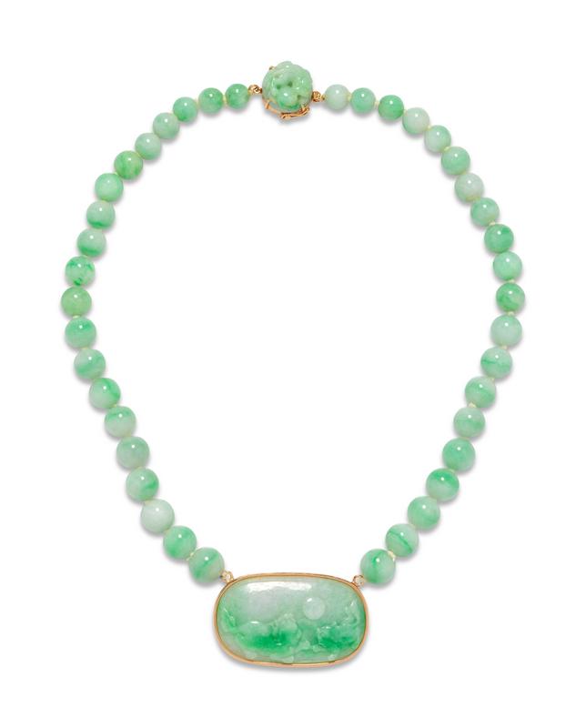 attributed to David Lin, containing 40 green jade beads measuring approximately 6.90-9.45 mm strung knotted with a central oval carved Foo Dog motif jade plaque measuring approximately 40.00 x 24.00 mm, with a yellow gold clasp containing one round carved jade plaque measuring approximately 13.65 mm in diameter.
