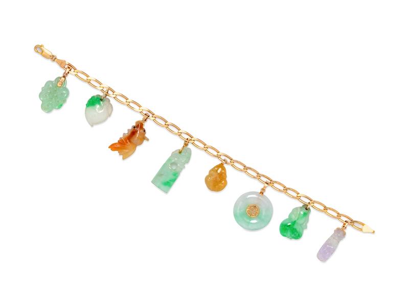 attributed to David Lin, consisting of a 14 karat gold pierced and carved jade knot charm, a white/green jade fruit motif charm, a 14 karat gold and carved russet jade fish charm, a 14 karat gold and carved mottled green Foo dog motif seal charm, a yellow gold and carved yellow jade frog charm, a 14 karat gold and mottled green/white jade bi charm, a carved mottled green/white jade fruit motif charm, a 14 karat gold and carved lavender jade belt hook charm.
