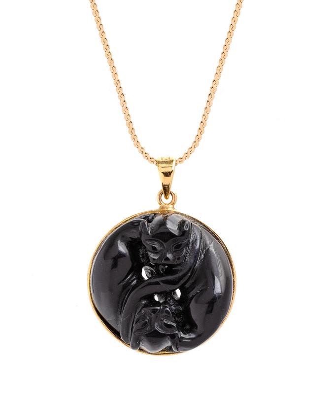 attributed to David Lin, containing a pierced and carved black jade pendant measuring approximately 19.00 mm in diameter suspended from a serpentine link chain measuring approximately 1.00 mm wide.