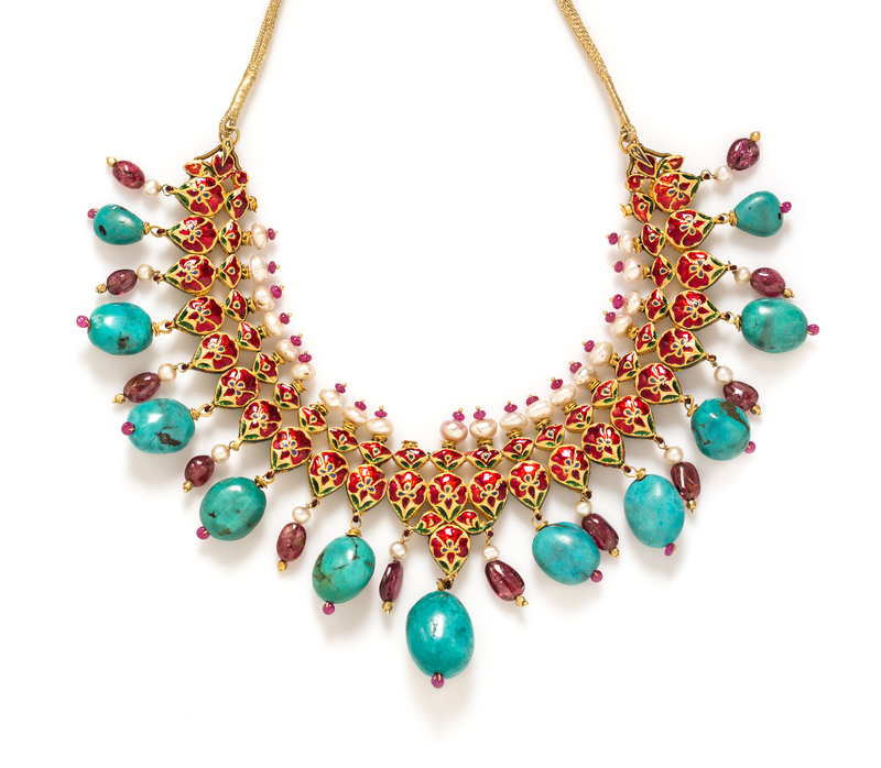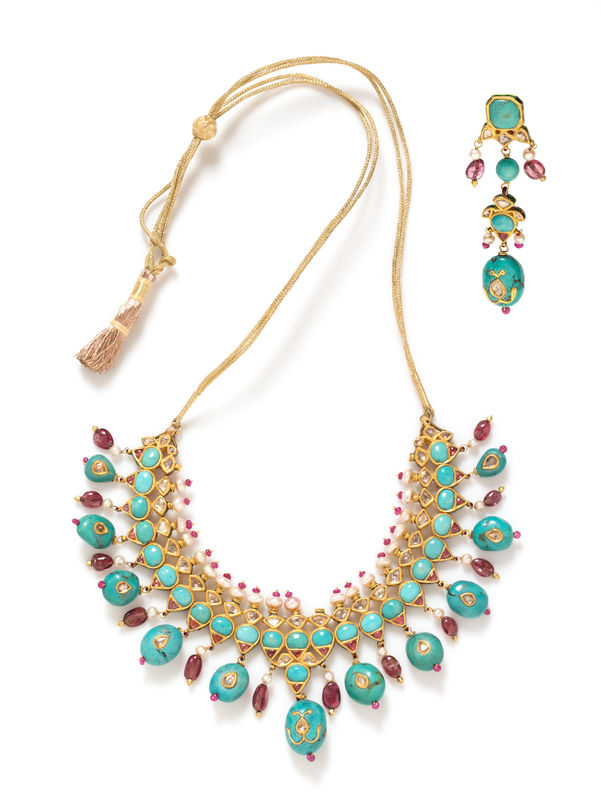 in a Mughal style, consisting of a necklace with 23 links each containing a cabochon cut turquoise, cabochon cut ruby, lasque cut diamond and topped with a pearl and ruby finial, suspending a fringe of turquoise bead pendants set with lasque cut diamonds and ruby finials and alternating with ruby and pearl pendants, the sides and reverse containing polychrome enamel in a foliate motif, together with a matching single earring.