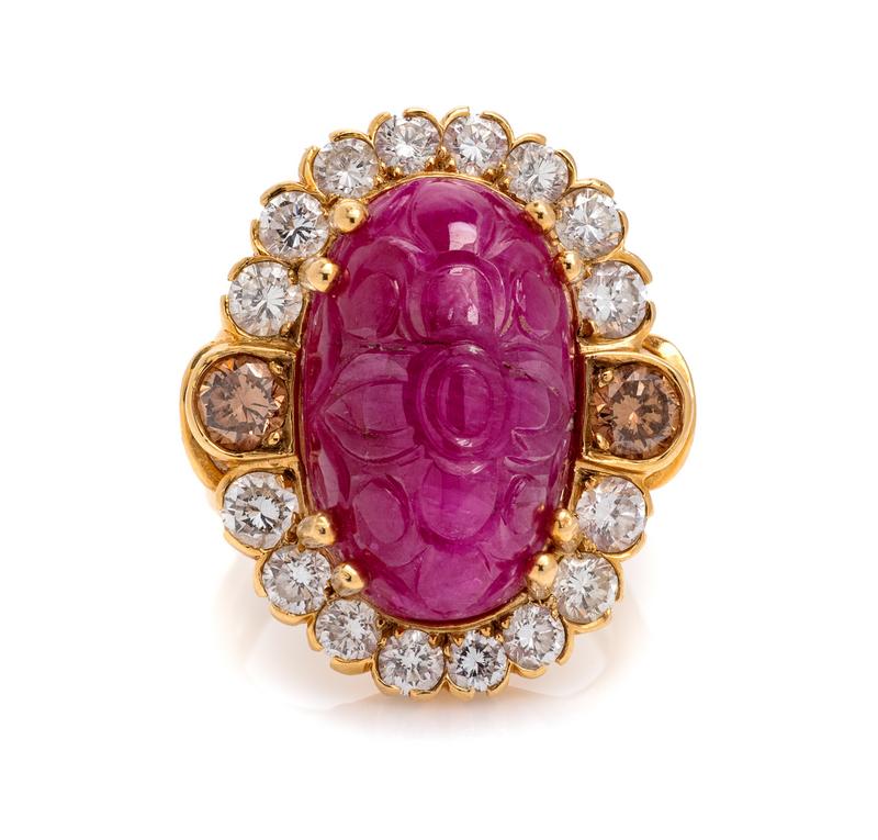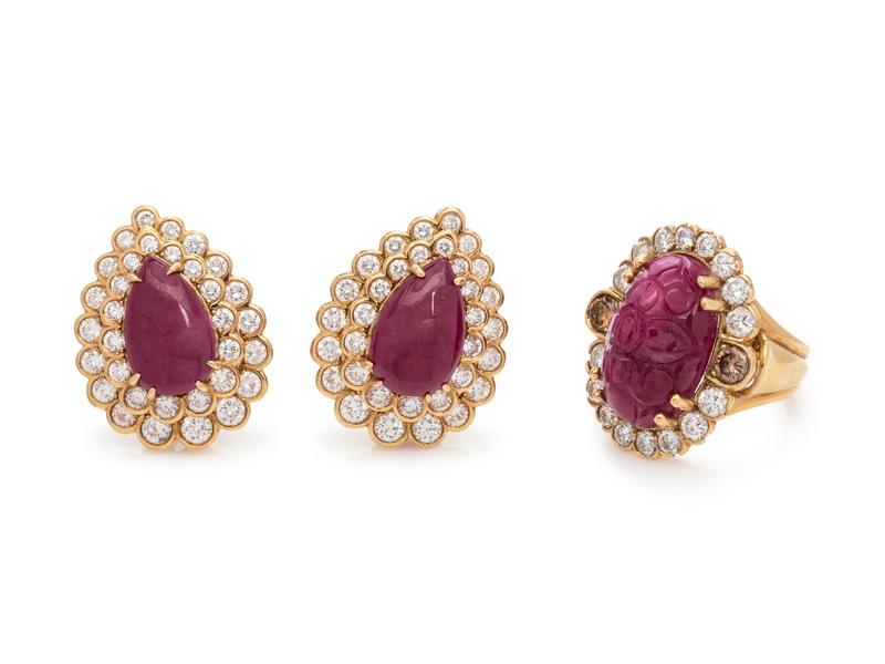 consisting of a ring containing one oval cabochon cut carved ruby measuring approximately 21.88 x 13.50 mm, two round brilliant cut colored diamonds (origin not tested) weighing approximately 0.80 carat total and 16 round brilliant cut diamonds weighing approximately 2.40 carats total, together with a pair of clipback earrings containing two pear shape cabochon cut rubies measuring approximately 18.00 x 11.34 mm and 66 round brilliant cut diamonds weighing approximately 4.95 carats total.