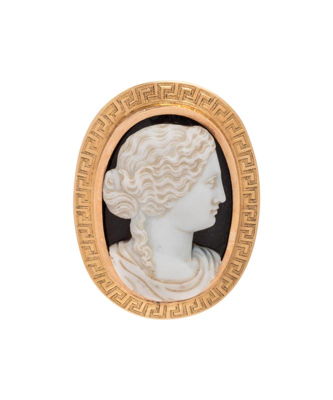 consisting of an oval onyx cameo measuring approximately 36.00 x 26.00 mm depicting a Classical female profile within a Greek key motif setting.