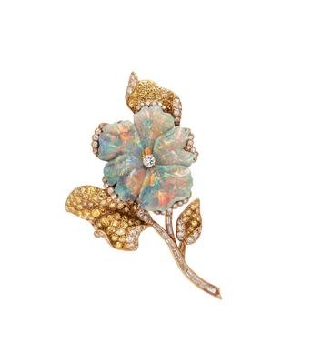 containing one carved opal plaque, 94 round brilliant cut yellow diamonds (origin not tested) weighing approximately 2.80 carats total, 66 round brilliant cut diamonds weighing approximately 1.05 carats total and 17 baguette cut diamonds weighing approximately 0.35 carat total.