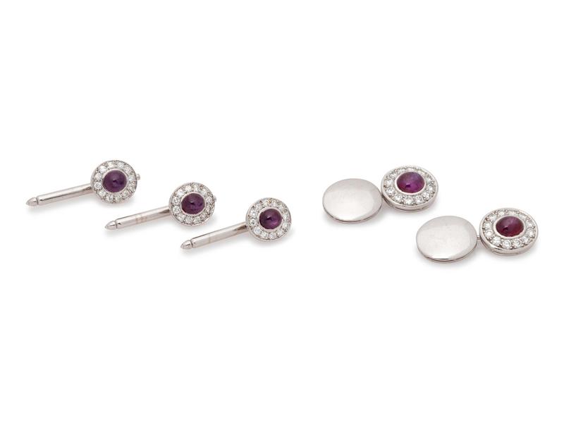 consisting of a pair of white gold cufflinks containing two oval shape cabochon cut rubies and 24 round brilliant cut diamonds weighing approximately 0.70 carat total, together with three white gold shirt studs containing three oval shape cabochon cut rubies and 36 round brilliant cut diamonds weighing approximately 0.50 carat total, with white gold backs.