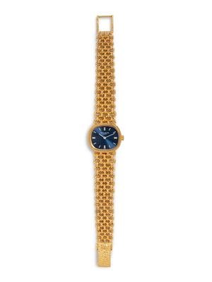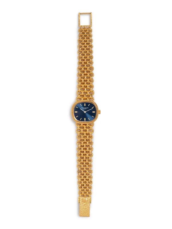 22.00 x 20.00 mm case dimensions, blue dial signed PATEK PHILIPPE, applied gold baton numerals, white pencil hands, snap on case back, 18 jewel manual wind movement adjusted to heat, cold, isochronism and five positions signed PATEK PHILIPPE, integrated textured link bracelet, fold over clasp.