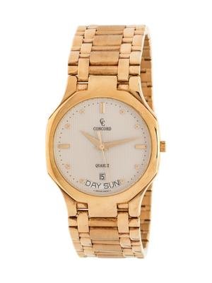 30.00 mm case diameter, off white dial signed CONCORD, applied gold baton and dot numerals, gold dauphine hands, case back affixed by eight screws, quartz movement, polished and brushed link bracelet, double deployant clasp.