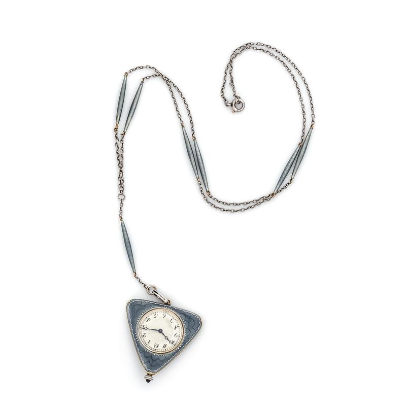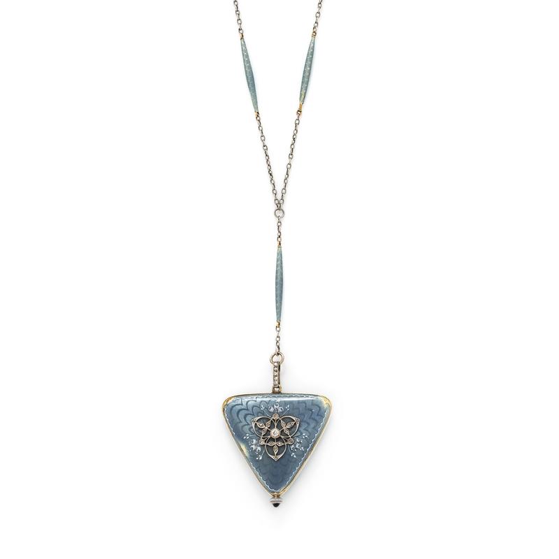 consisting of a gold pendant, 32.00 x 3200 mm case dimension, matte silvered dial, black Roman numerals, blued steel Breguet hands, case and bezel accented with blue and white enamel and foliate motif plaque containing 16 old mine and rose cut diamonds, stem wound and set 15 jewel nickel movement with five adjustments signed C.H. MEYLAN, pendant suspended from a white gold lavalier chain with blue enamel tubular links.