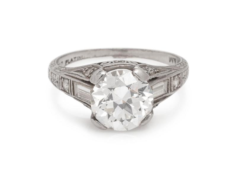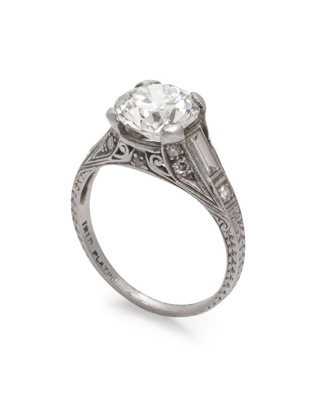 containing one round brilliant diamond weighing 2.05 carats, two baguette cut diamonds weighing approximately 0.20 carat total and five round single cut diamonds.