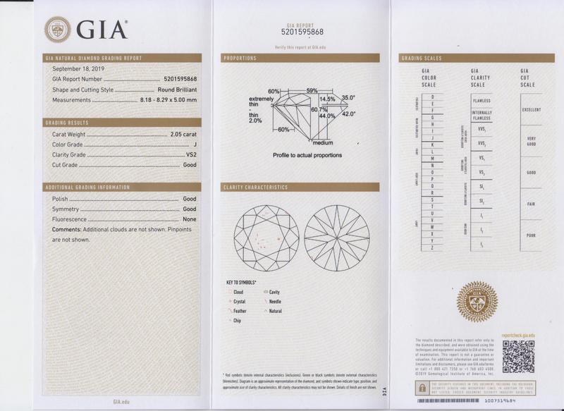 GIA, 2019, Report number 5201595868, 2.05 carats, J color, VS2 clarity, No fluorescence