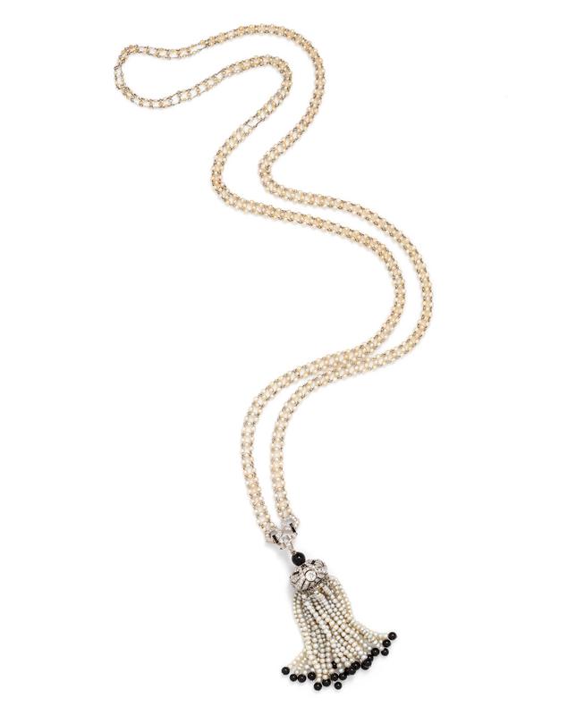 consisting of a mesh work seed pearl chain joining at a central openwork plaque containing four French cut onyx, 24 old European and single cut diamonds, suspended from the plaque is an intricate openwork pendant containing nine French cut onyx, three old European cut diamonds weighing approximately 0.75 carat total, numerous single cut diamonds, suspending a fringe composed of 20 strands of pearls (origin not tested) and onyx beads strung on chain.