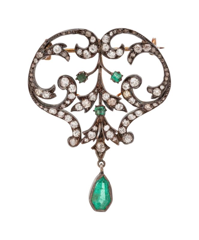 containing one shield shape step cut emerald measuring approximately 8.67 x 4.97 mm, three square step cut emeralds and numerous old mine and single cut diamonds.