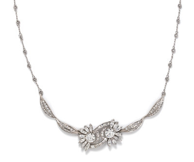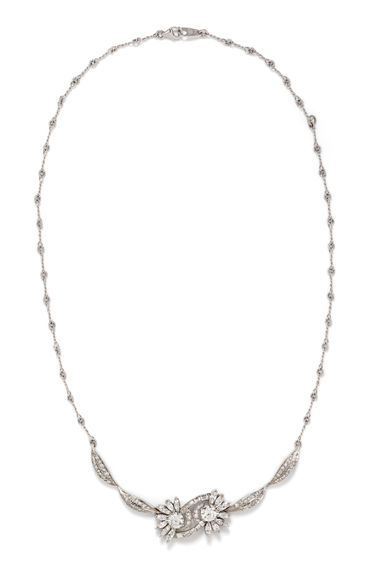 consisting of a central floral motif containing two round brilliant cut diamonds weighing approximately 1.95 carats total, 14 marquise cut diamonds weighing approximately 2.10 carats total, 10 baguette cut diamonds weighing approximately 0.60 carat total and 66 single cut diamonds weighing approximately 1.00 carat total, suspended from a twisted wire chain.