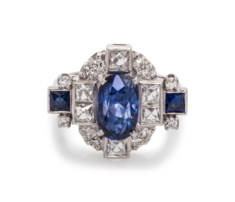 containing one oval mixed cut sapphire measuring approximately 10.00 x 6.15 x 6.35 mm, two French cut sapphires measuring approximately 3.25 x 2.83 mm, six French cut diamonds weighing approximately 0.75 carat total and 12 single cut diamonds weighing approximately 0.25 carat total.