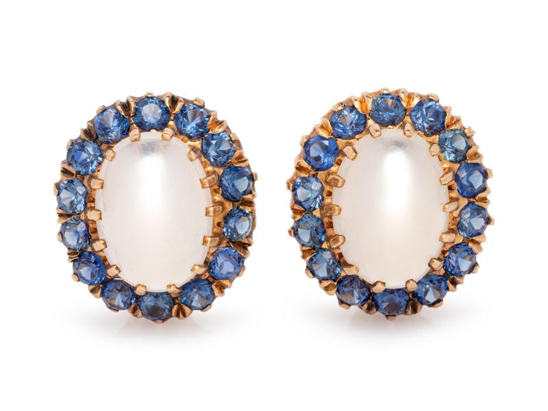 containing two oval cabochon cut moonstones measuring approximately 13.84 x 9.82 mm and 28 round mixed cut sapphires measuring approximately 3.00-3.20 mm in diameter.
