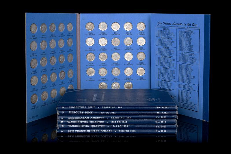 comprising 15 Benjamin Franklin 50c, 63 Pre-1965 Washington 25c, 1 Standing Liberty, 38 Mercury 10c, 85 Pre-1965 Roosevelt 10c, 32 WW-II era Jefferson 5c, 10 Buffalo 5c, 4 Liberty 5c, 3 Eisenhower $1, 1 Five-Coin mint set and a 1969 5-Coin Proof Set.