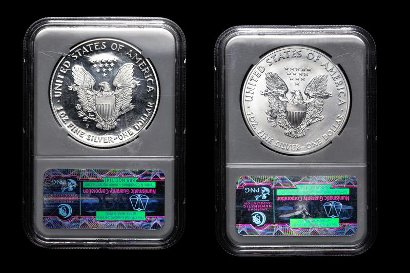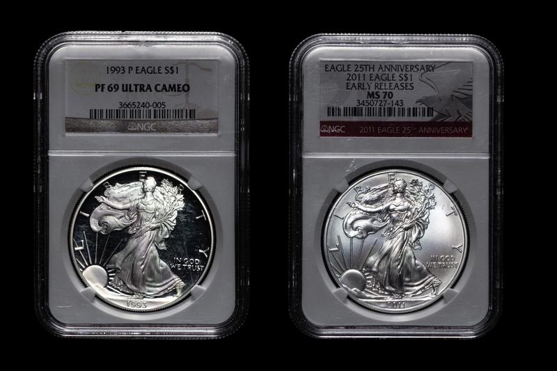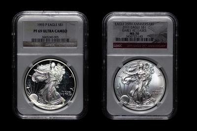 A 1993-P Silver Eagle Proof (NGC PF 69 Ultra Cameo) and 2011 Early Release Silver Eagle (NGC MS 70)
