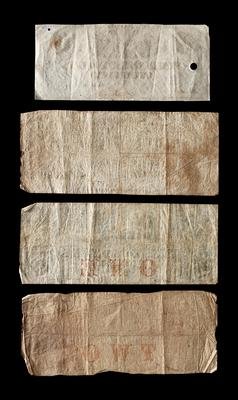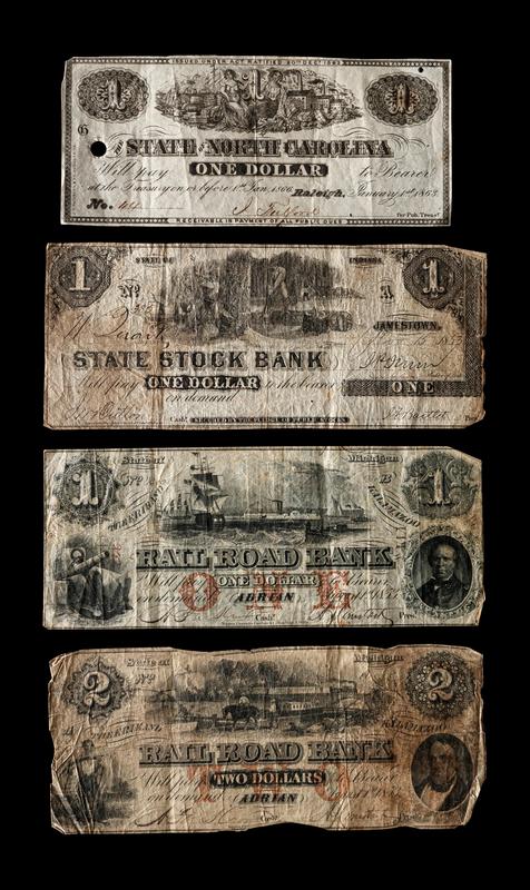 comprising an 1853 Erie and Kalamazoo Rail Road Bank, Adrian, MI $1 and $2, an 1853 State Stock Bank, Jamestown, IN, $ and an 1864 State of North Carolina $1 example.
