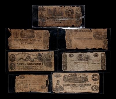 comprising an 1821 State Bank of Newark, Newark, NJ $5, 1853 Bank of Kentucky: Newport Safety Fund, Newport, KY $3, 1840 The Water Canal Co, Baltimore, MD $3, 1844 Lockport Bank, Lockport, NY $5, 1841 Whitehaven and Lusanne Turnpike Road Co., Whitehaven, PA $1 and a 1847 New Ark Manufacturing Co., New Ark, OH $5, together with a Confederate States of America 1862 T-39 $100 note.