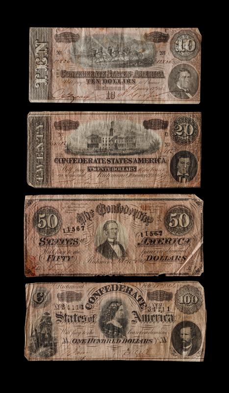 comprising a frame inset with a T-66 $50, T-67 $20 and a T-69 $5 example, a similar framed example with a T-65 $100, T-68 $10 and a Georgia State Issued $5 example, together with a non-framed T-65 $100, T-66 $50, T-67 $20 and a T-68 $10 example.