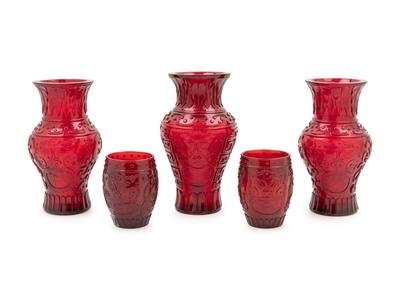 comprising three vases and two cups, each decorated in low relief of taotie mask motifs.
