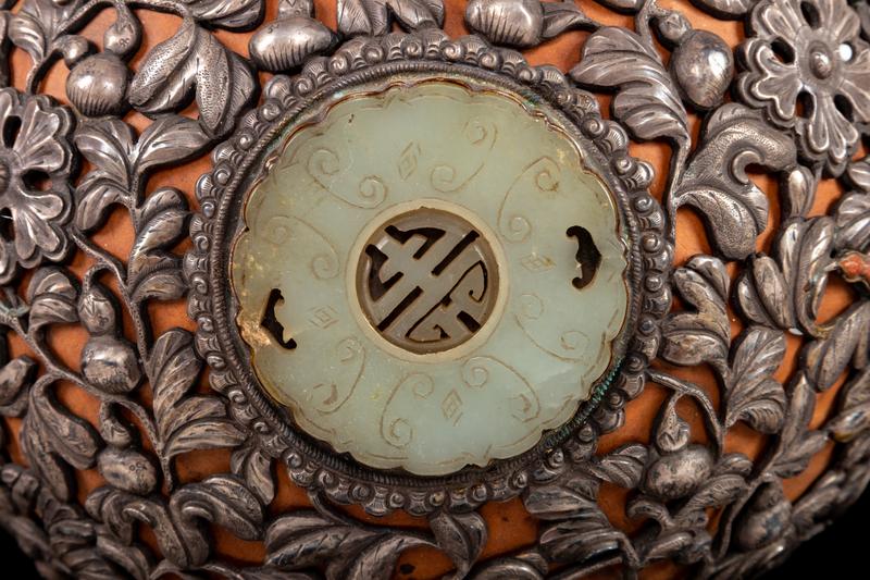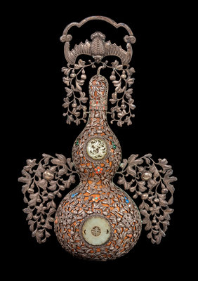 with a web of leafy vines of chased silver flanking the waist and spreading to encase the body, bearing fruits and blossoms of coral, turquoise, lapis, emerald and goldstone, with celadon jade plaques surrounded by silver bosses centered at each lobe; with a removable stopper surmounted by a silver bat-form pendant grasping descending vines.
