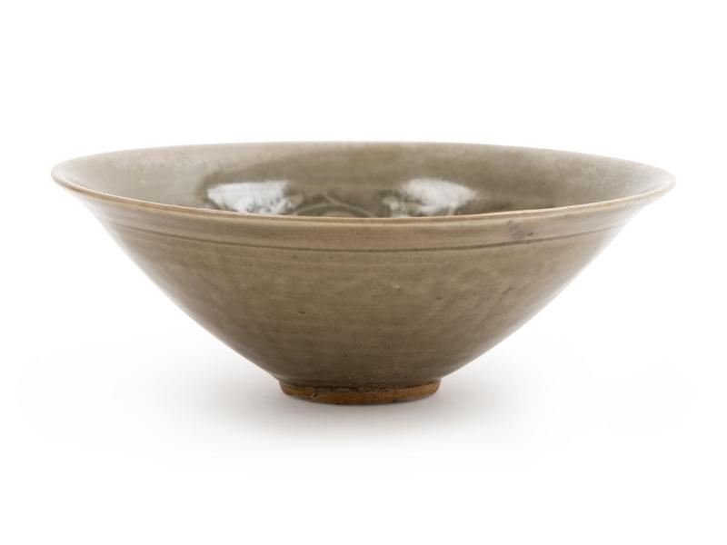 the conical sides rising from a short straight foot to a slightly everted rim, molded to the interior with a dense floral scroll, covered overall with an olive-green glaze.