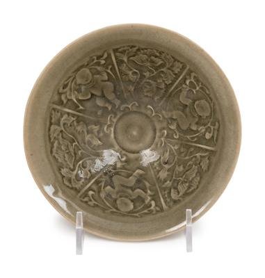 宋 耀州窯青釉模印牡丹童戲圖碗