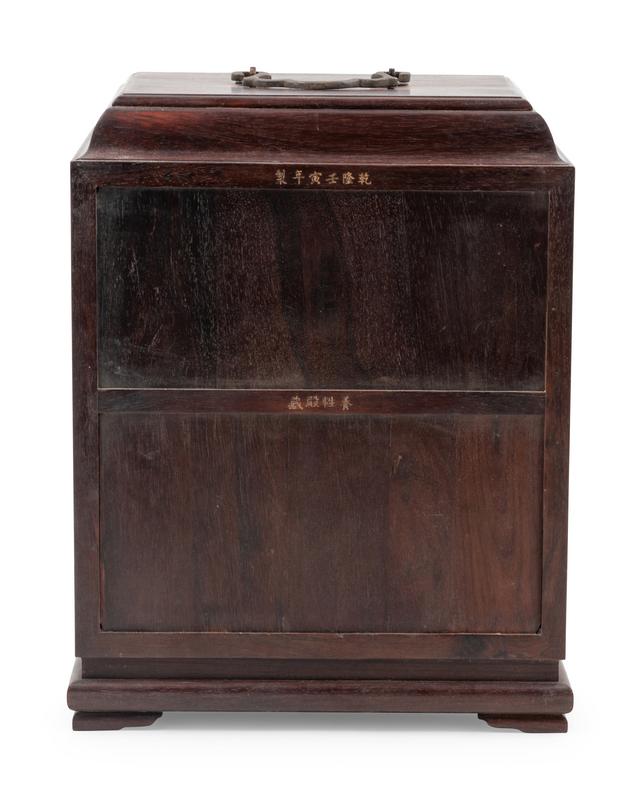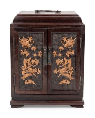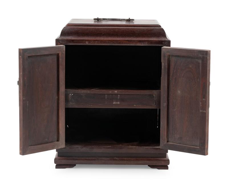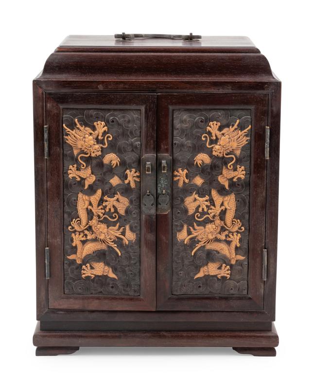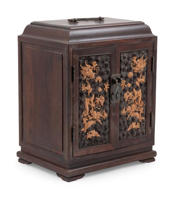 the rectangular chest has a domed top, the two single-panel doors decorated with dragons in high-relief, the interior has shelves and one center drawer.