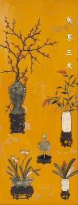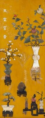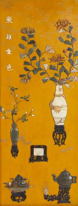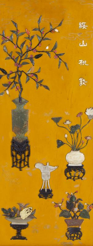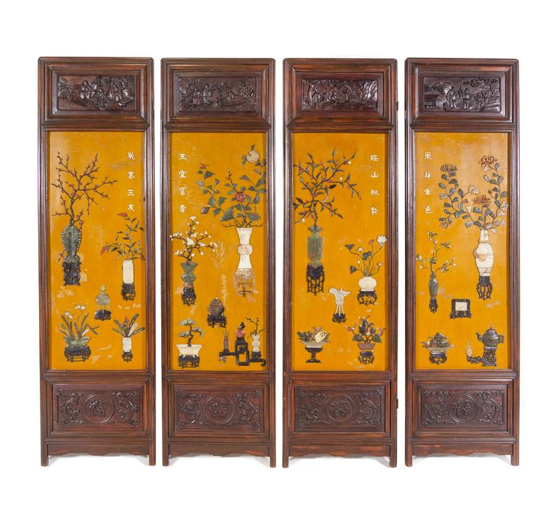 each screen is set into hardwood frames, and inset with various materials including jade, soapstone hardwood to depict archaistic vessels, all on an ochre yellow lacquered ground.