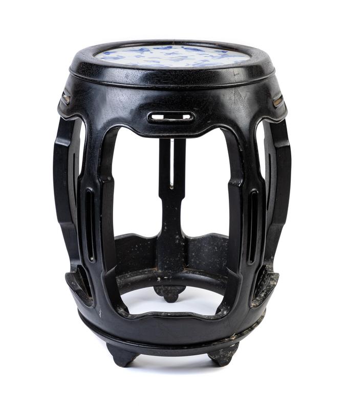 A Blue and White Porcelain Inset Black Lacquered Elmwood Stool
