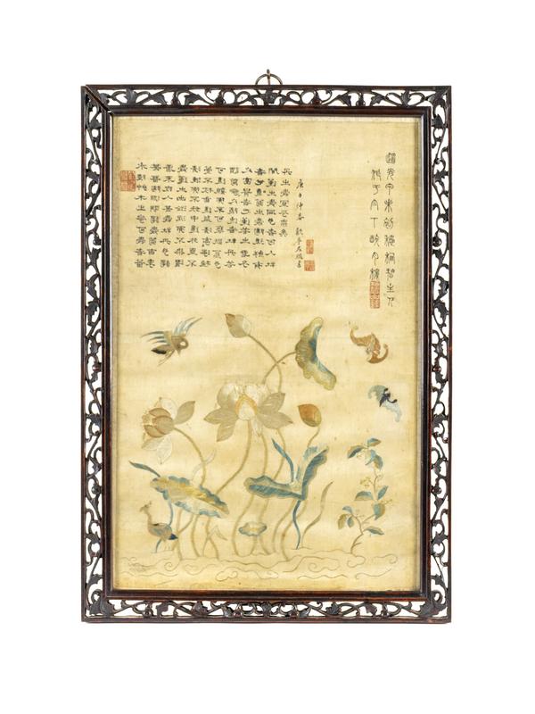 finely decorated with a pond scene with lotus buds, cranes and butterflies, above them there's a left handed written verse and four artist's seals.