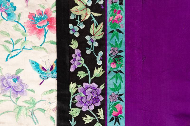 with a side opening, worked in multi color threads as flitting butterflies amidst sprays of begonias, the design repeated on the black ground borders and the ivory-ground cuffs, all against a purple ground.