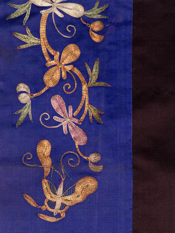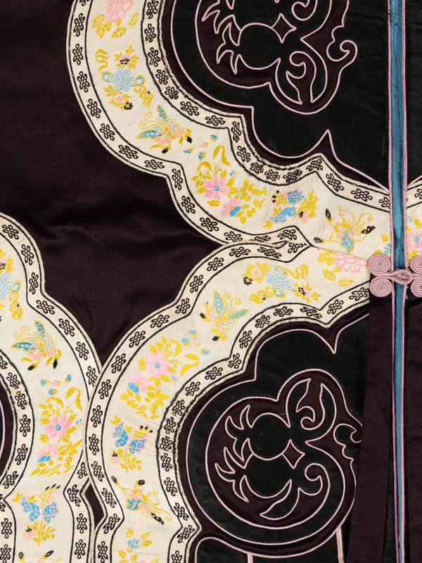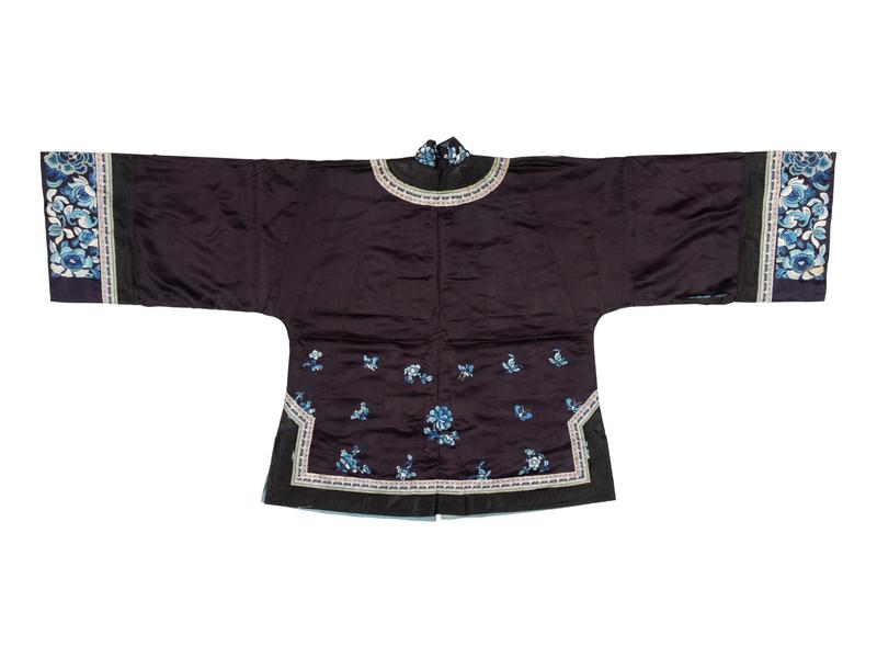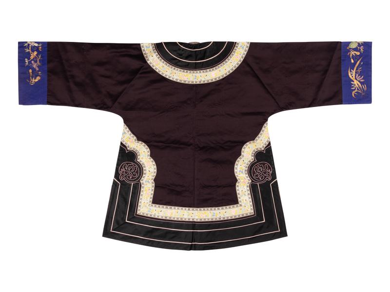 清晚期 黑綢地石榴紋如意云頭綫香滾女袍及黑緞地鑲織帶打籽綉花蝶圖女襖各一