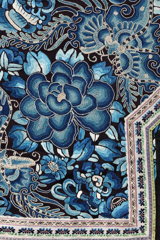each embroidered against a black ground with floral designs and auspicious emblems, such as ruyi-head motifs and peonies.