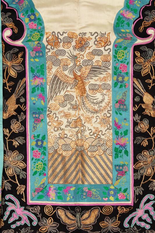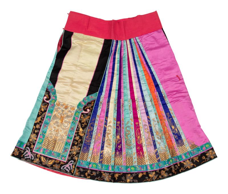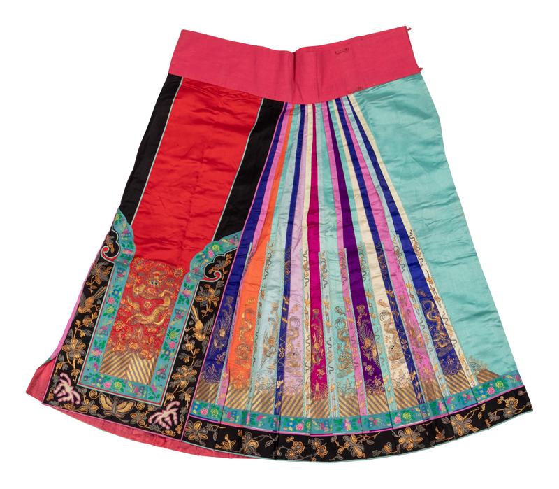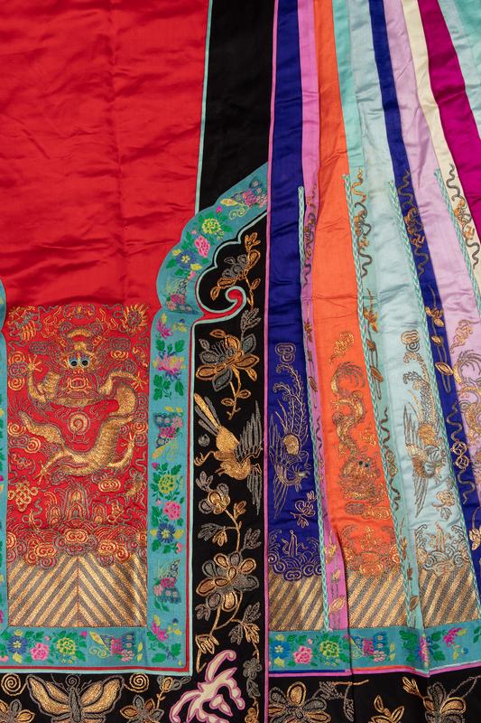 of multicolored ground pleated and embroidered in gilt threads of dragons and butterflies amidst leafy branches.